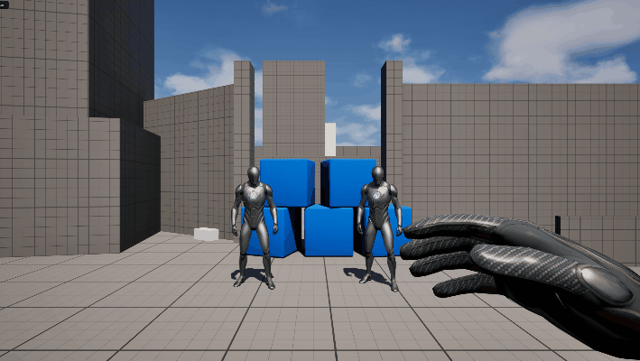 For the windblast a bounding box is used in front of the player. This returns all physics objects. Regular objects have an impulse applied to them and are blasted away. If an object is a skeletal mesh it is first set to radgoll before being blasted.